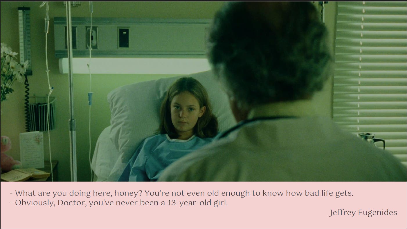 “Unlike the conventional ‘girl’ films, which treat the state of ‘girlhood’ as merely a transitional stage from innocently ignorant childhood to mature womanhood, Coppola converges her attention to this particular stage of ‘girlhood’. She treats it as an independent state, one worthy enough to receive the dedication of this entire film. For instance, the Lisbon girls do not go through the process of maturity from ‘ignorant innocence’. [...] ‘girlish’ femininity manifested in conventional girl films is marked by a collective performance of ‘ignorant innocence’ – a display of immaturity or vanity. It is different in The Virgin Suicides. In the first place, the heroines in the film rarely exhibit such childish qualities, and their suicides allow them to embody ‘girlish’ femininity from the beginning to the end of the film. Equally striking is the film’s complex construction of girlish femininity itself. Femininity has been understood and presented through a set of binaries in western culture. Such binaries often evolve around two (almost opposing) imageries of femininity including Madonna/Whore (Ross and Nightingale 2003: 80), Rapunzel/Medusa (Ofek 2009: 104) and Ophelia/Girl Power (Gonick 2006: 15–16). The former of each of these dichotomous paradigms embody purity, innocence and docility while the latter types symbolize a sexually mature, dangerous side of femininity. Rather than placing the girls on either side of two extreme poles of femininity, I would argue strongly that The Virgin Suicides fuses and merges the antithetical poles of fragile and assertive girlish femininity (Monden, 2013, 141).